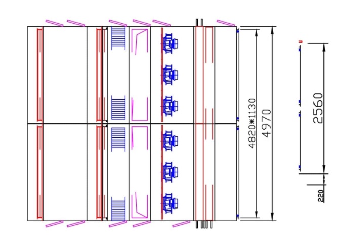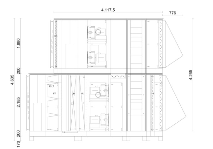 В качестве примера рассмотрим техническое решение приточно-вытяжной установки одного из известных европейских производителей (рис.2) производительностью по приточному и удаляемому воздуху 60 000 м3/ч с роторным утилизатором теплоты, имеющим коэффициент температурной эффективности 0,65.