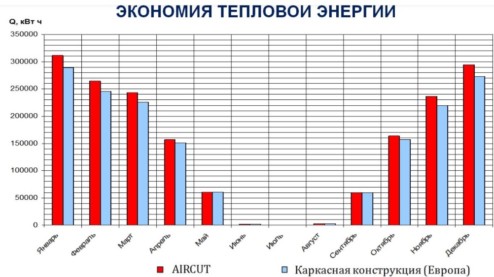 На рис.5 приведена оценка экономии тепловой энергии при применении роторных утилизаторов теплоты при круглосуточной круглогодичной работе установок в Москве. Годовая экономия тепловой энергии при применении установок Aircut на 110 700 кВт·ч превышает экономию теплоты в сравниваемых европейских установках.