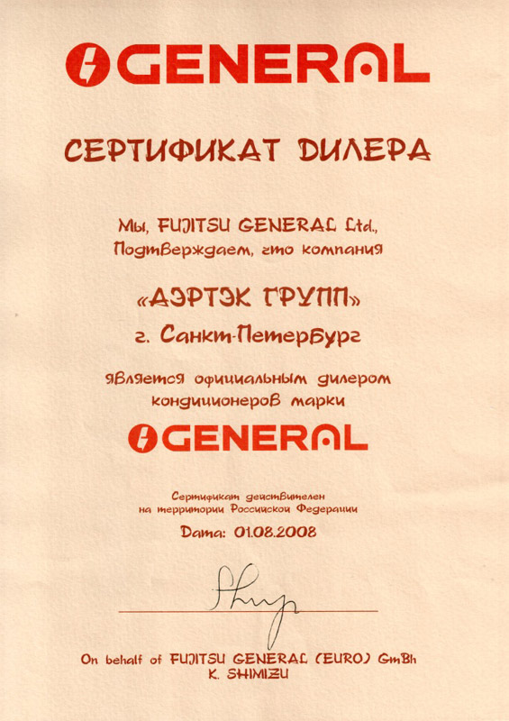 Сертификат регионального представительства General