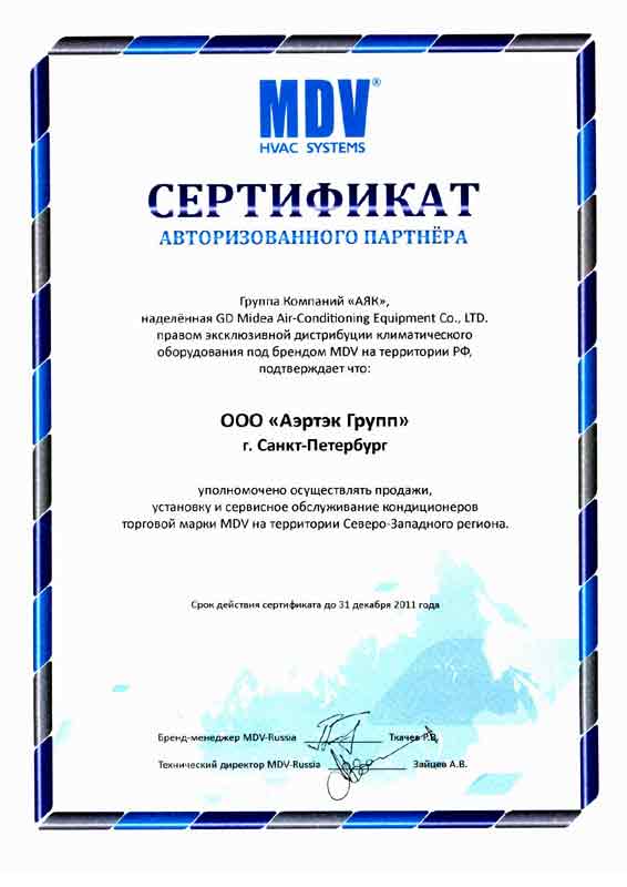 Сертификат авторизованного партнера ГК "АЯК" по оборудованию MDV