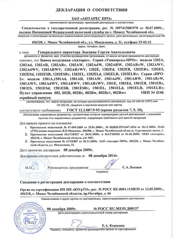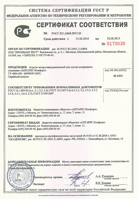 Сертификат соответствия госстандарта на АВН «АНТАРЕС Комфорт»