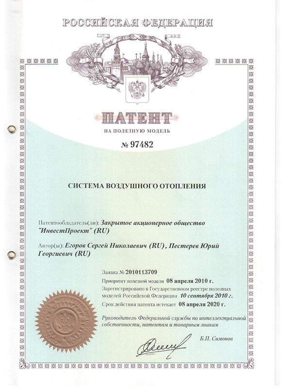 Патент на систему воздушного отопления «АНТАРЕС Комфорт»