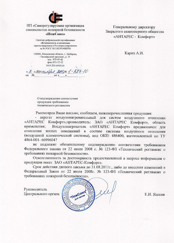 Письмо НП «ПожСоюз» по пожаробезопасности