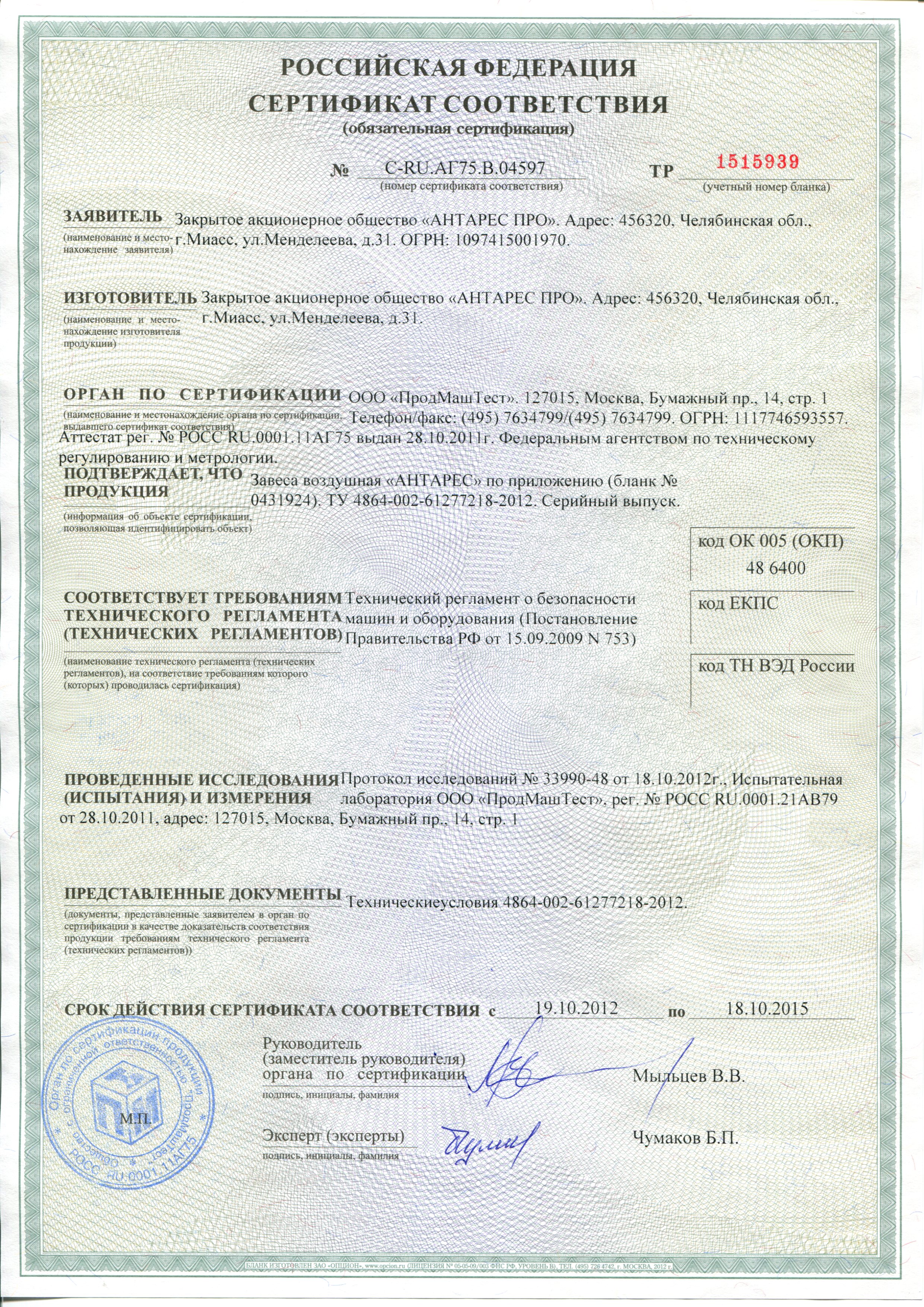 Сертификат соответствия завесы воздушной "АНТАРЕС" техническому регламенту о безопасности машин и оборудования