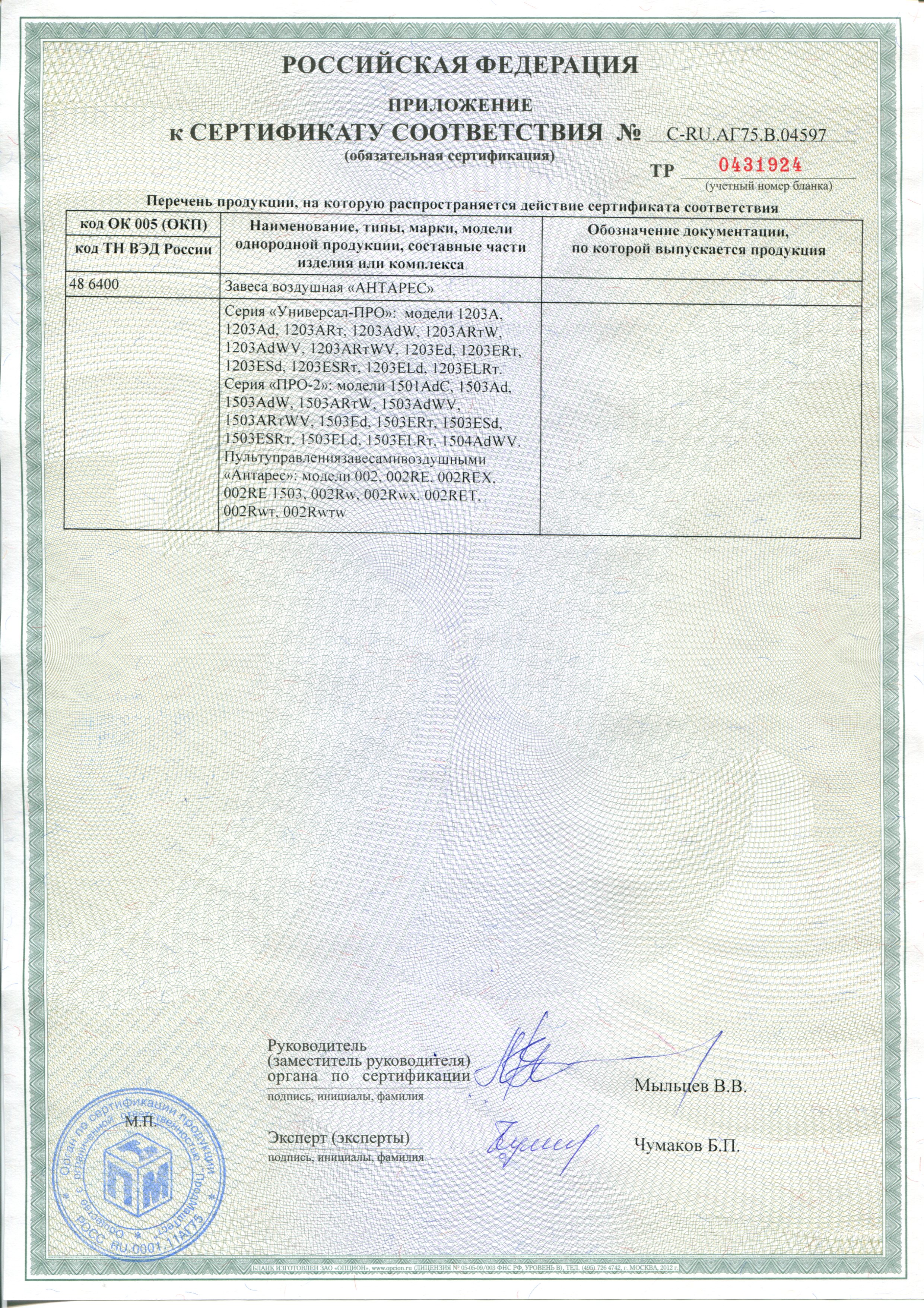 Сертификат соответствия завесы воздушной "АНТАРЕС" техническому регламенту о безопасности машин и оборудования. Приложение