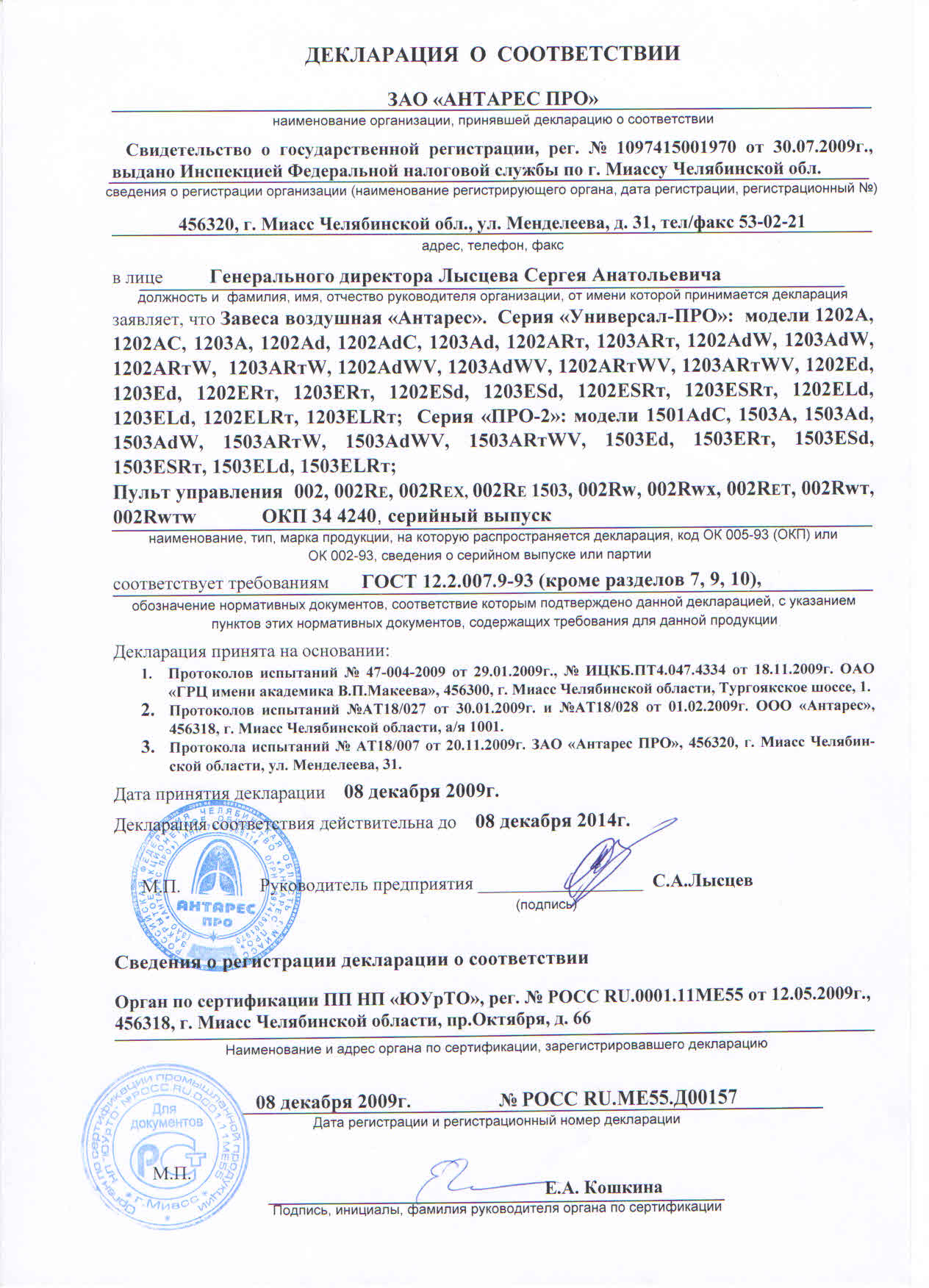 Декларация о соответствии завесы воздушной "АНТАРЕС" ГОСТ 12.2.007.9-93