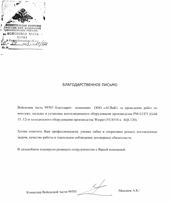 Войсковая часть 99703 благодарит компанию ООО «АСВиК» за проведение работ по монтажу, наладке и установке вентиляционного оборудования производства PM-LUFT (Gold 15, 12) и холодильного оборудования производства Wesper (VLS554 и AQL120).
