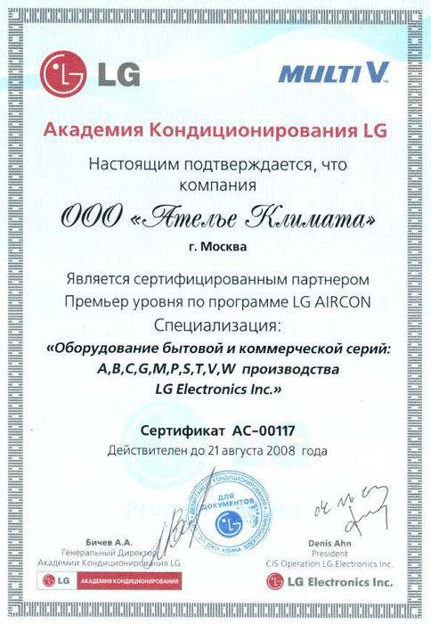 Сертификат партнёра Премьер-уровня по программа LG AIRCON