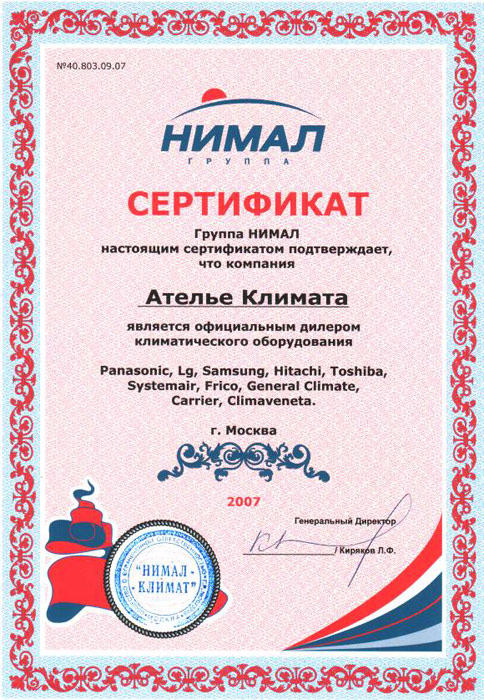 Сертификат дилера климатического оборудования