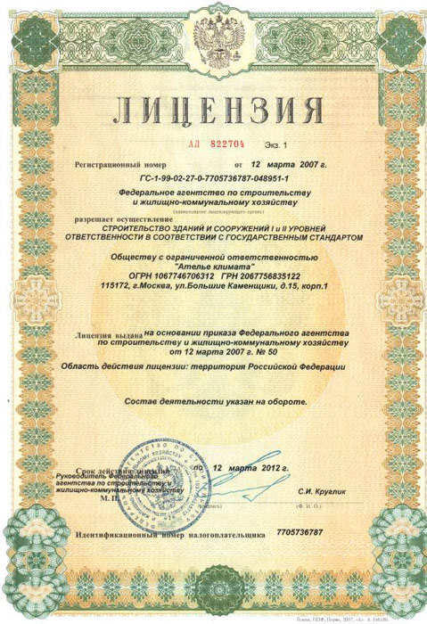 Лицензии и сертификаты компании Ателье Климата