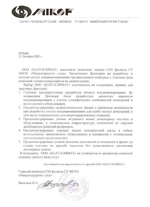 ООО «БАЛТ-КЛИМАТ» выполнило несколько заказов СПб филиала ГУ МНТК «Микрохирургия глаза». Заключению Договоров на разработку и монтаж систем кондиционирования предшествовали конкурсы с участием ряда компаний специализирующихся на данном рынке.