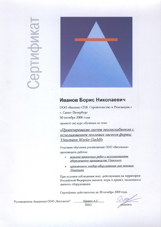 Сертификат на ведение проектных работ и подбор оборудования Viessmann