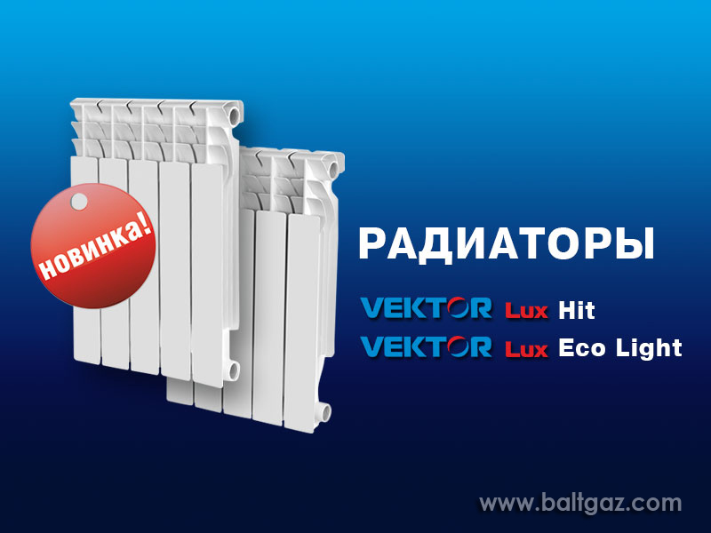 Радиаторы Vektor Lux Hit уже поступили во все регионы России. Новые модели радиаторов Vektor Lux Eco поступят в филиалы BaltGaz в середине апреля 2014 года. Подробнее о радиаторах можно узнать в каталоге продукции на сайте BaltGaz Групп,