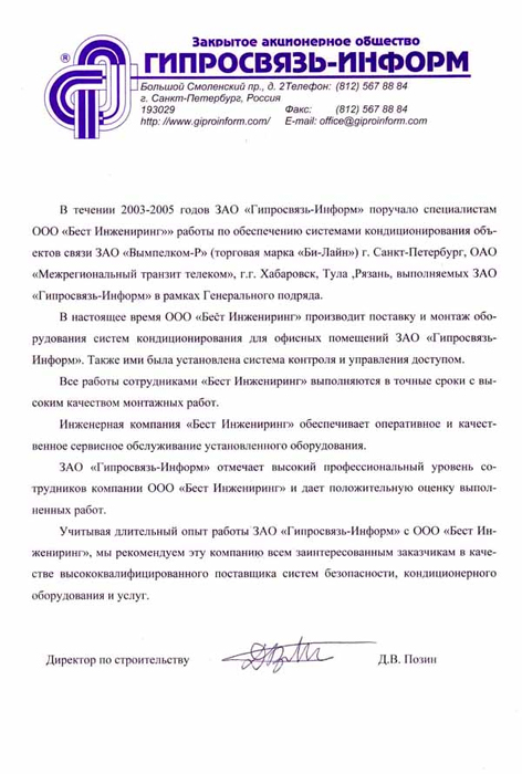 Учитывая длительный опыт работы ЗАО «Гипросвязь -Информ» с ООО