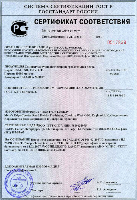 Сертификат соответствия на саморегулирующую нагревательную ленту FSM, FSR, FSLe, GTe,