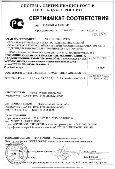 сертификат соответствия на кабель одножильный нагревательный TXLP/1