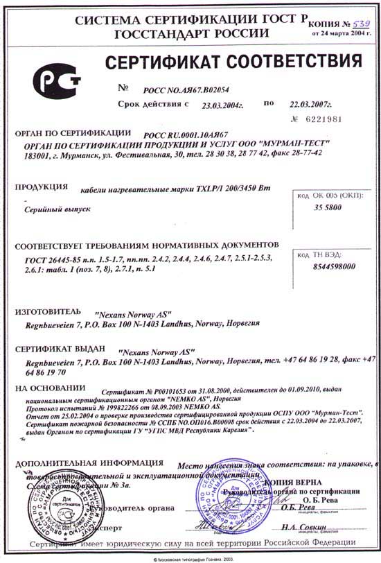 Cертификат соответствия на кабель нагревательный TXLP/1
