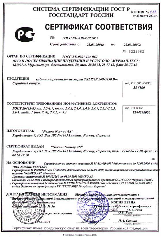 Cертификат соответствия на кабель нагревательный TXLP/2R