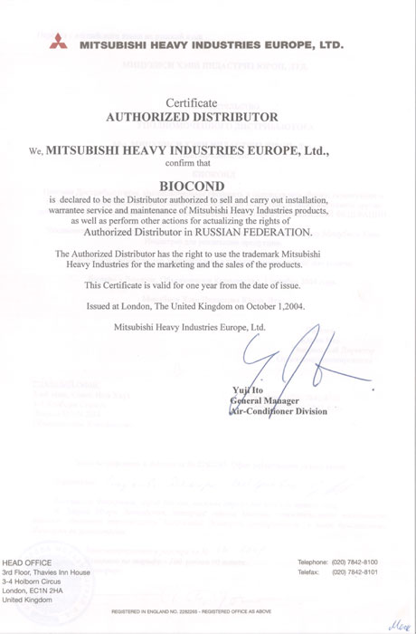 Дистрибьютерский сертификат Mitsubishi Heavy Industries
