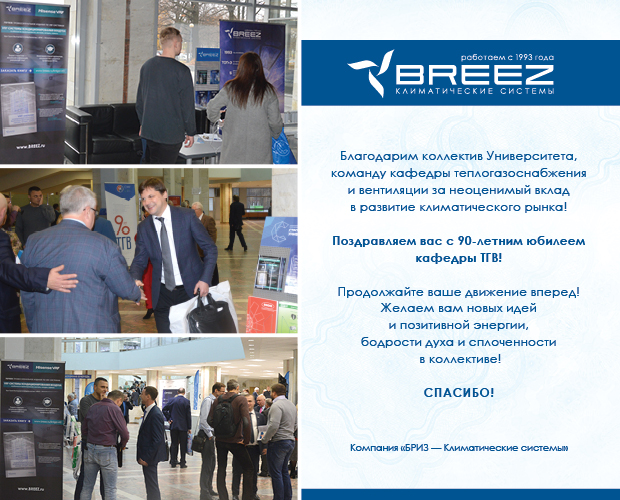 В официальной части юбилейной программы технический директор компании «БРИЗ – Климатические системы» Константин Григорьев поздравил коллектив университета, преподавателей, студентов и выпускников факультета ТГВ с 90-летием образования кафедры и преподнес от имени компании подарок: в научно-техническую библиотеку университета было передано 40 книг «VRF-системы кондиционирования воздуха. Особенности проектирования, монтажа, наладки, сервиса». Это первое российское издание о VRF-системах, написанное Сергеем Викторовичем Брухом в сотрудничестве с инженерами компании «Бриз – Климатические системы» и при поддержке Hisense VRF. Символический сертификат на книги был передан Лушину Кириллу Игоревичу, директору Института инженерно-экологического строительства и механизации.