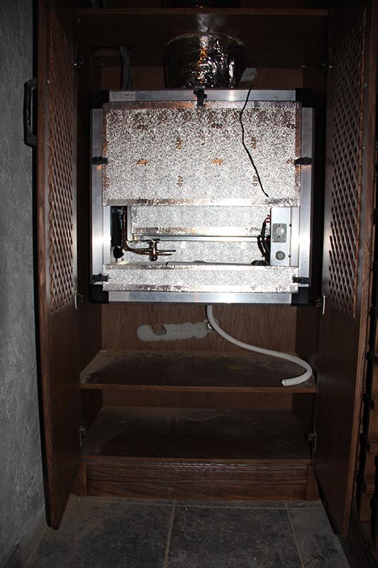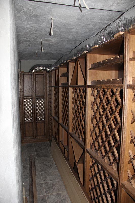 Для длительного хранения вина использована сплит-система FRIAX SPC 48 EVI + HGR% (наружный блок размещается на улице, внутренний блок канального типа вертикального расположения, система поддержания влажности HGR%). Система рассчитана на поддержание температуры в диапазоне +12/+14 С и относительной влажности 60-80% в помещениях объемом до 48 м3 (при выполнении теплоизоляции изнутри охлаждаемого помещения слоем пенополиуретана толщиной не менее 60 мм – стены, пол и потолок).