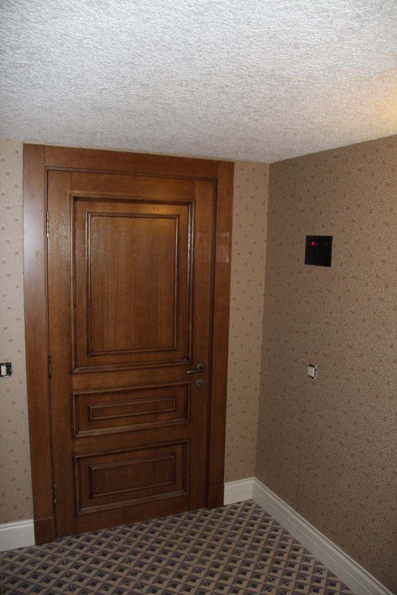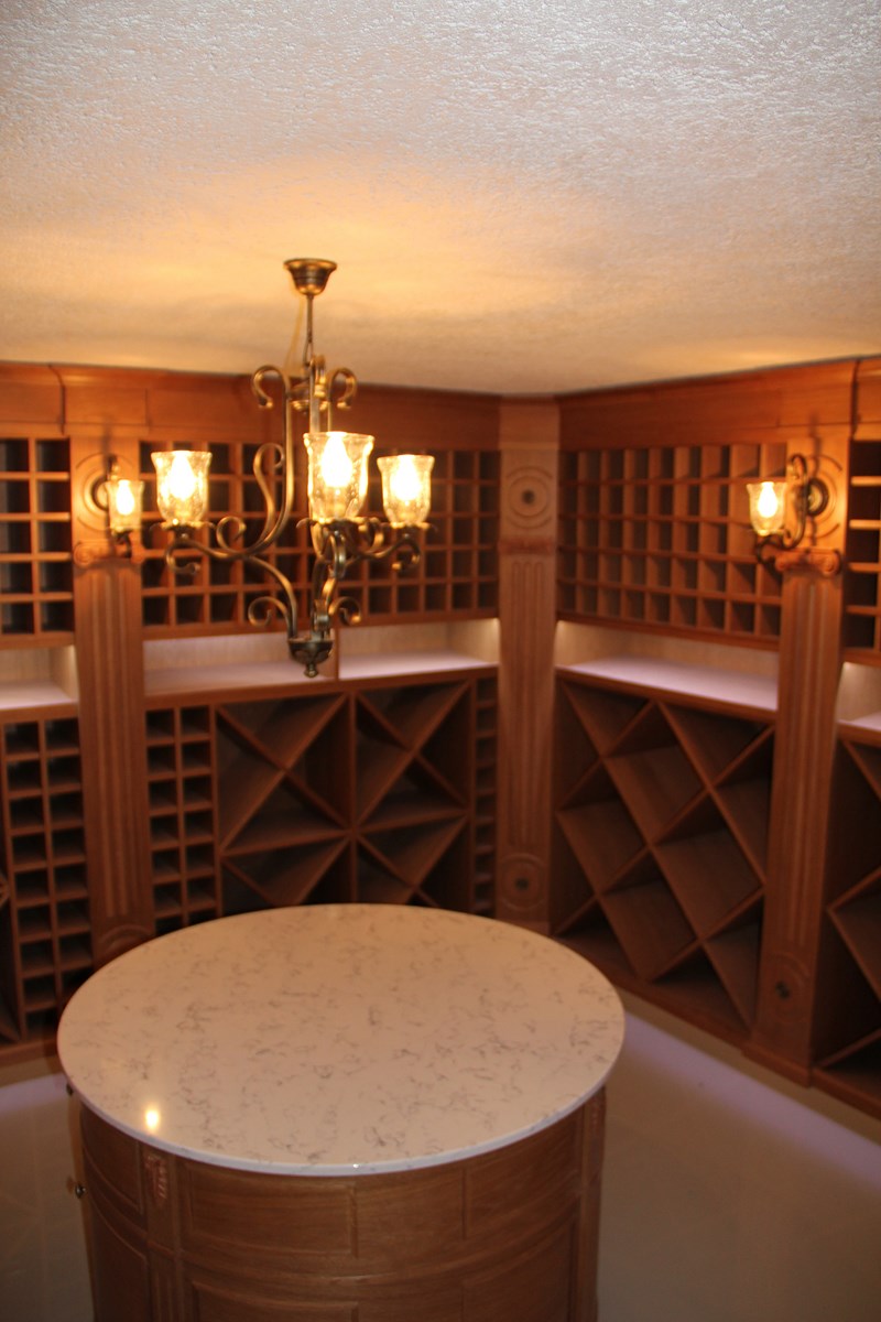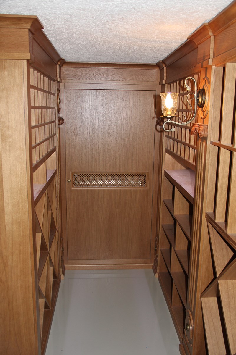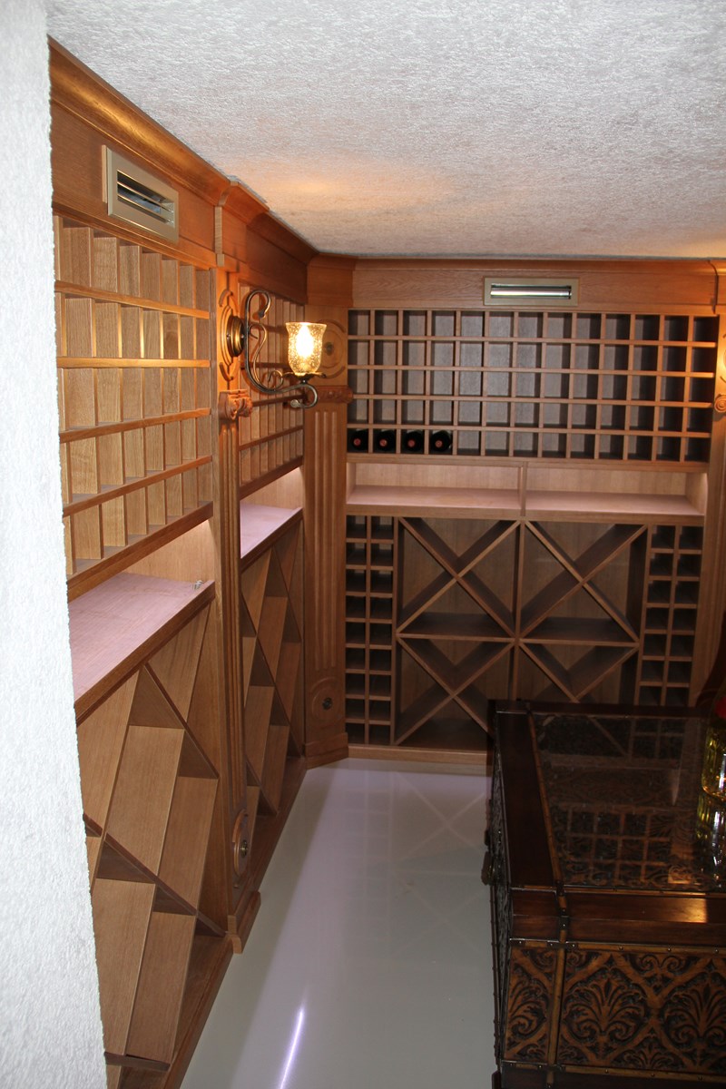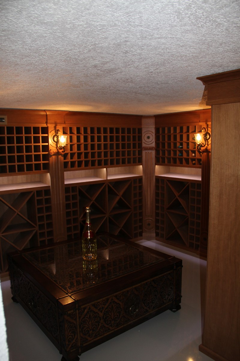 Стеллажи для хранения вина изготовлены под заказ по индивидуальным размерам. Материал – массив дерева и шпонированный МДФ. Также изготовлены из дерева некоторые предметы интерьера для винного погреба.