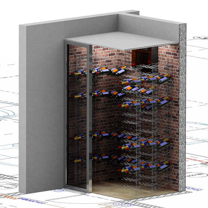 Данный проект представляет собой компактное винное хранилище объёмом всего 3 м3. Помещение оборудовано моноблоком Friax MPC 48 Vintage и металлическими стеллажами Visio Rack. Входная группа оборудована герметичным стеклопакетом.