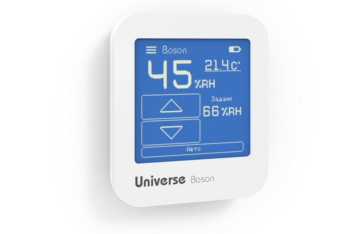 Boson – электронный пульт управления влажностью воздуха в помещении. С его помощью можно установить желаемую влажность, а также выбрать режим работы системы: автоматический, проверочный или выключенный. На экране пульта отображается актуальная влажность и температура в помещении. Boson имеет сенсорный экран, который автоматически гасится через некоторое время без использования, и активируется при нажатии.