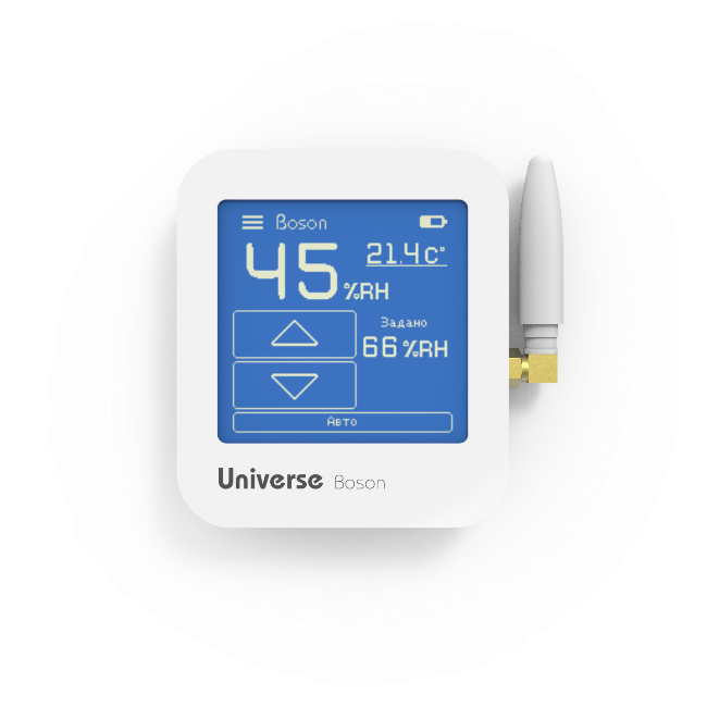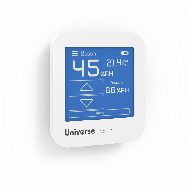 Boson – электронный пульт управления влажностью воздуха в помещении. С его помощью можно установить желаемую влажность, а также выбрать режим работы системы: автоматический, проверочный или выключенный. На экране пульта отображается актуальная влажность и температура в помещении. Boson имеет сенсорный экран, который автоматически гасится через некоторое время без использования, и активируется при нажатии.