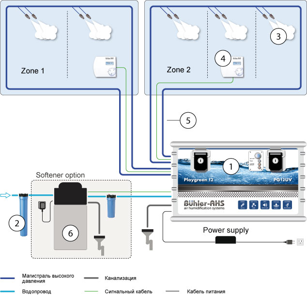 Каждая группа форсунок будет распылять воду сама по себе в зависимости от необходимой и фактической влажности. Таким образом, регулирующие подачу воды под давлением клапаны находятся внутри центрального модуля Playgreen. Специальная конструкция помогает быстро набирать и быстро сбрасывать давление в магистралях. Это необходимо для защиты от появления капелек на форсунках в том момент, когда давление еще недостаточно высоко.
