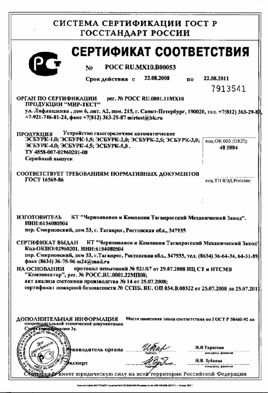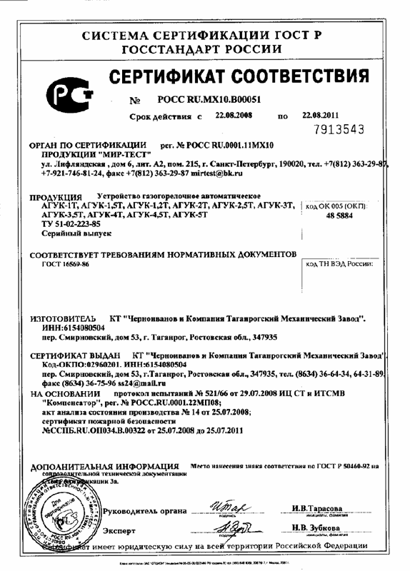 Сертификат соответствия госстандарта России на газовые горелки АГУК