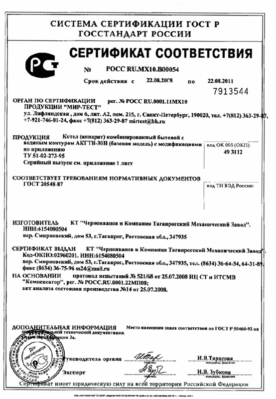 Сертификат соответствия госстандарта России на котёл АКГТВ-30Н