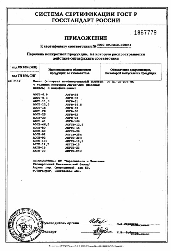 Сертификат соответствия госстандарта России на котёл АКГТВ-30Н, приложение