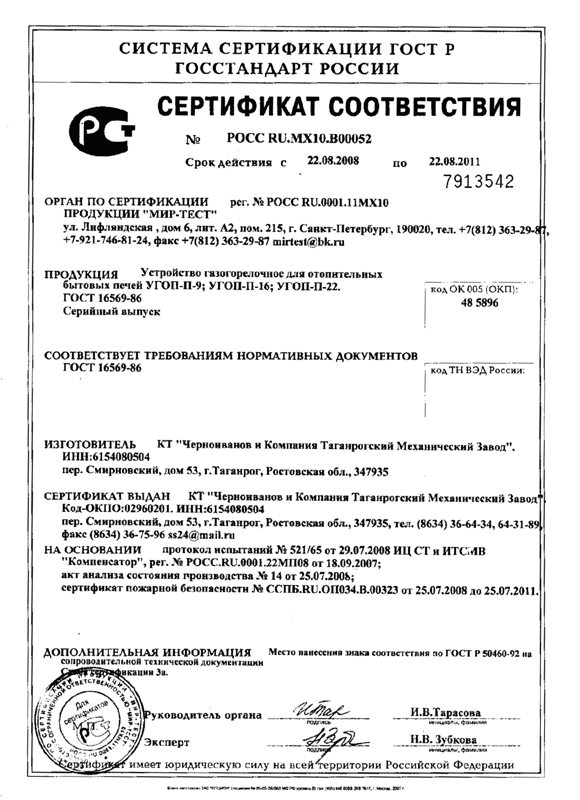Сертификат соответствия госстандарта России на газовые горелки УГОП