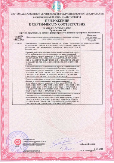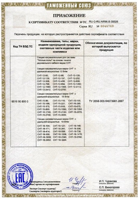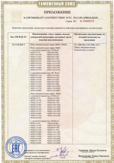 - Приложение к сертификату соответствия на маты нагревательные марок MHO и МНД