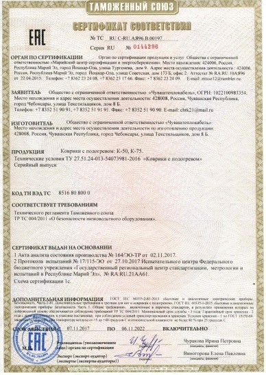 - Сертификат соответствия на коврики с подогревом: К-50, К-75