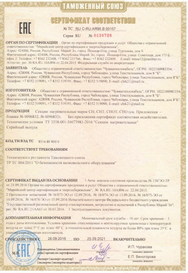 - Сертификат соответствия на секции нагревательные марки СТ 10, 15, 18 2017 года