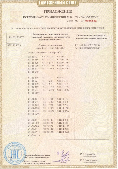 - Приложение к сертификату соответствия на секции нагревательные марки СНТ