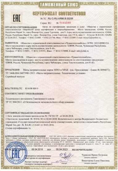 - Сертификат соответствия на маты нагревательные марок MHO и МНД