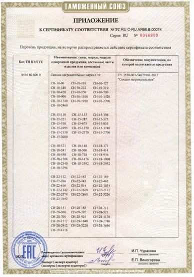 - Приложение 1 к сертификату соответствия на секции нагревательные СТ 10, 15, 18 2017 года