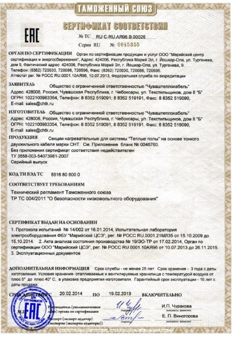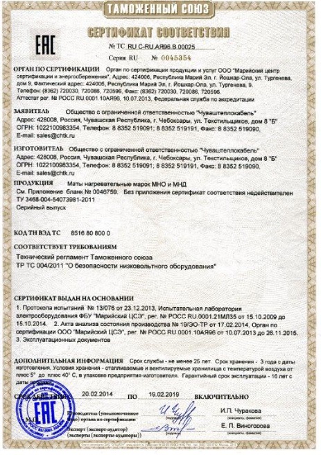 - Сертификат соответствия на маты нагревательные марок MHO и МНД (2014 г. - 2019 г.)
