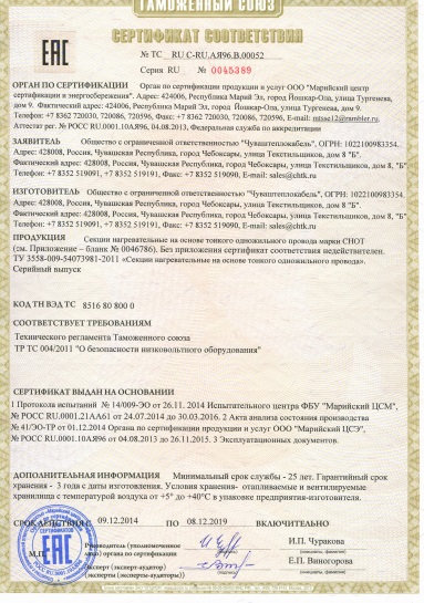 - Сертификат соответствия на секции нагревательные марки СНОТ
