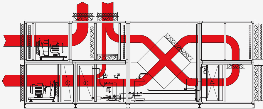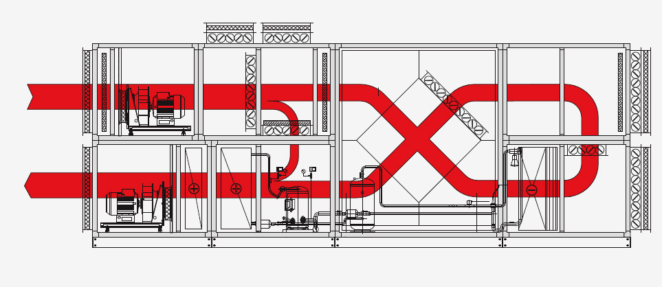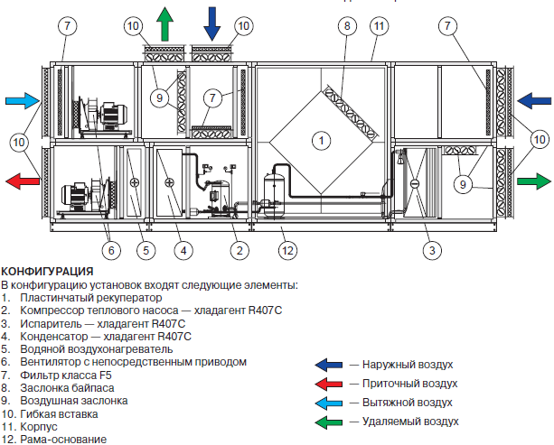 Основной задачей, стоящей перед данными вентагрегатами является поддержание параметров уровня влажности и температуры. Данная функция реализована благодаря наличию встроенного компрессорно-конденсаторного блока, в состав которого входят испаритель, конденсатор и компрессор теплового насоса (хладагент R407C). В данных агрегатах происходит многоступенчатое осушение воздуха, что позволяет осуществлять обработку воздуха круглый год при различных параметрах. Существуют следующие режимы работы вентиляционных установок: