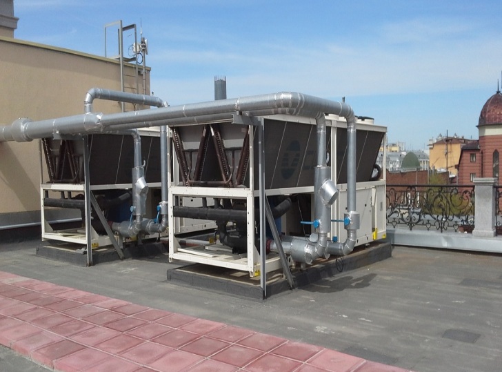 На кровле здания установлены 2 чиллера CLIVET WSAT-XSC2 220F. Холодопроизводительность каждого чиллера 575 кВт. Чиллеры версии Premium имеют высокую эффективность при частичной нагрузке и при этом компактные размеры. Поэтому данное решение подходит для объектов, где требуются минимальные первоначальные инвестиции.