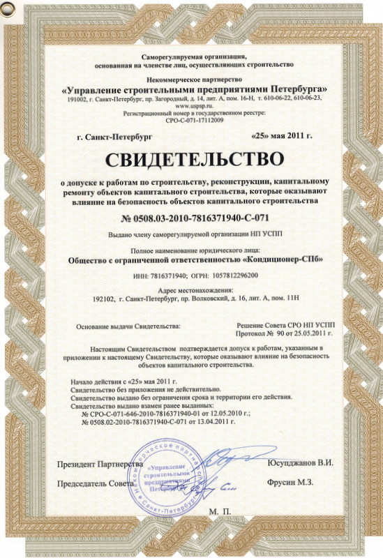 Свидетельство № 0508.03-2010-7816371940-С-071