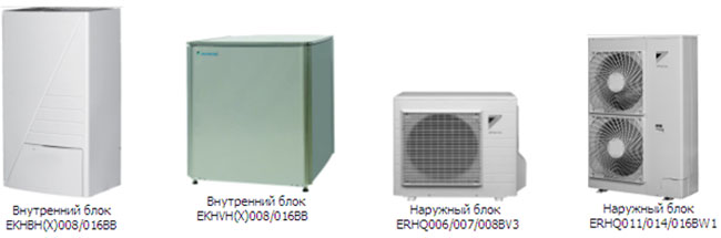 Добиться столь высокой энергоэффективности позволило инверторное управление работой компрессора. Представлены варианты компоновки системы для нагрева и охлаждения или только для нагрева воды мощностями от 6 до 16 кВт. Этого достаточно для отопления или охлаждения дома площадью 150 кв. м. Внутренние блоки настенного и напольного типа — это гидромодули, внутри которых установлен теплообменник типа «фреон-вода». К блокам подводятся трубы бытового водоснабжения, а также от теплых полов, низкотемпературных радиаторов водяного отопления и фанкойлов. Вода в гидромодулях нагревается до +55 °С, а охлаждается до +5 °С.