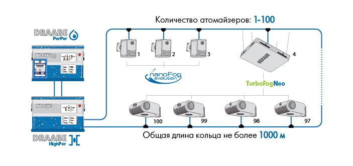 Для гигиенической безопасности вода постоянно циркулирует в трубопроводе рабочего контура системы. Стерильно чистая вода, не использованная для увлажнения, не сливается в канализацию, а возвращается к насосу высокого давления, где обеззараживается под действием УФ-излучения, а затем снова попадает в контур. Кроме того, в те отрезки времени, когда увлажнение не требуется, через форсунки атомайзеров (внутренних модулей увлажнения) периодически принудительно распыляется порция воды, которая не циркулирует, так как находится в участках труб перед атомайзерами. При этом соленоидные клапаны, открывающиеся в процессе увлажнения, расположены внутри атомайзеров и в непосредственной близости от форсунок, а не в самом начале системы. Таким образом, в системе Draabe вода никогда не застаивается, в ней нет условий для развития микроорганизмов. Вследствие циркуляции отсутствуют потери воды, уже подготовленной для увлажнения, и, тем самым, снижаются эксплуатационные расходы. 100%-но гигиенически безопасная система увлажнения Draabe предназначена для работы 24 часа в сутки 365 дней в году.