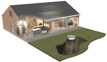 Daikin Altherma в геотермальном исполнении работает только в режиме теплового насоса, при этом тепло полностью выделяется из грунта. На первом этапе оно передается солевому раствору (антифризу), циркулирующему в контуре трубопровода, который прокладывается на определенной глубине. Контур имеет вид горизонтального коллектора или вертикального зонда. Затем в первом теплообменнике происходит передача полученного таким образом тепла от антифриза хладагенту холодильного контура. Далее хладагент сжимается в компрессоре, нагреваясь до высокой температуры, и во втором теплообменнике тепло передается воде, циркулирующей в трубопроводе системы отопления.