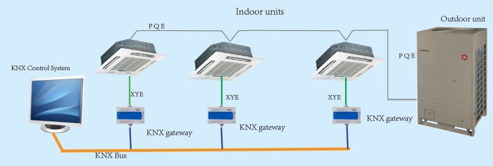 KNX – это наиболее популярный коммуникативный стандарт автоматизации зданий (охватывает 70% европейского рынка). Шлюз KCB-20 совместим со всем оборудованием Kentatsu VRF. Он дает возможность с центрального пульта управления зданием переключать режимы системы кондиционирования, задавать температуру воздуха, скорость вращения вентилятора, управлять качанием заслонки, вести учет отработанных часов и отслеживать коды возникающих ошибок.