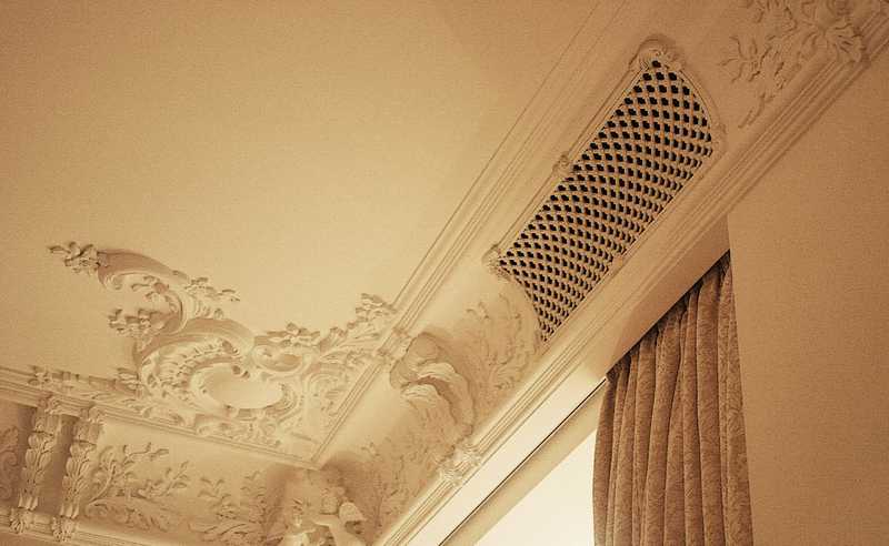 Гипсоваля лепнина с узорами и ангелами, изогнутая вентиляционная решетка из пластика.